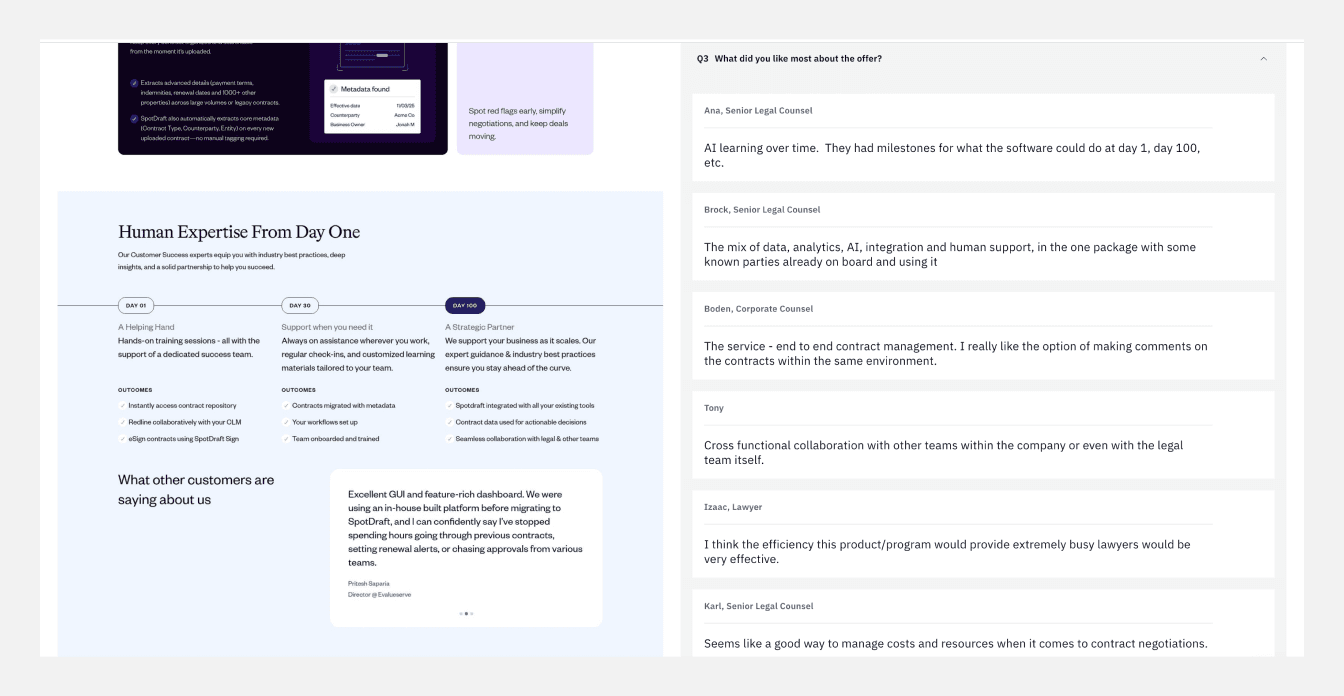 Beyond the redesign, we built the infrastructure to support SpotDraft’s future marketing efforts. This extended into an ABM campaign, where we integrated Clay to generate personalized pages for each prospect, down to dynamically embedding their logos within the visuals. These subtle details helped create a more tailored and engaging experience.